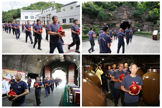 讓時光入酒,以歲月藏香。稻花香以封藏之禮,致敬歲月與匠心。活動現(xiàn)場,秦玉龍、曾洋、謝永文、蘇順平、陳小林共同移步至臺前,為凝聚天地精華與匠心智慧的美酒進(jìn)行封壇。在所有人期待的目光中,釀酒師傅們應(yīng)聲上前,抱起覆上紅綢的酒壇,如同護(hù)送珍貴的寶物一般,站成一條莊嚴(yán)的隊伍,向著象征歲月與沉淀的藏酒洞方向進(jìn)發(fā)。