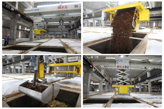 秦玉龍鳴笛發(fā)令,啟動馫香型白酒生產(chǎn)釀造。智能起入窖機(jī)器人根據(jù)指令平穩(wěn)運(yùn)行,投窖、起糟、轉(zhuǎn)運(yùn)……整個過程行云流水,充滿了現(xiàn)代工業(yè)的美感與力量。領(lǐng)導(dǎo)及嘉賓移步至右側(cè)安全護(hù)欄旁,一同觀摩智能行車入窖、起糟工序。